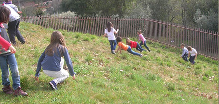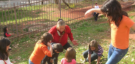 Os alunos entrando no espírito da época que contextualiza toda a brincadeira – a Páscoa – procuram animadamente os ovos de chocolate que estrategicamente foram escondidos no recinto da escola.