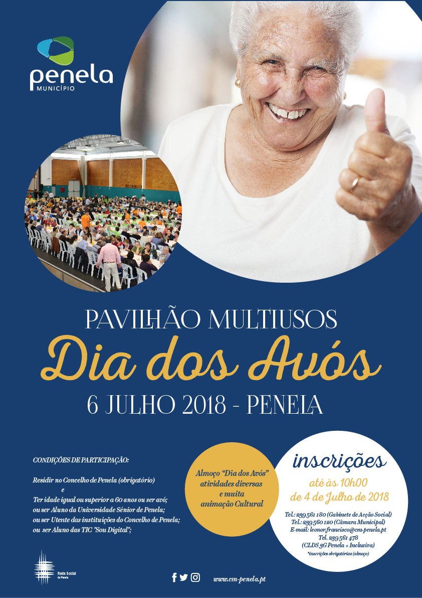 O Dia dos Avós vai ser, mais uma vez, assinalado pelo Município de Penela, no dia 6 de julho, com várias atividades no Pavilhão Multiusos de Penela. O evento, que procurará proporcionar um dia diferente aos avós do concelho, decorre entre as 10h00 e as 18h00, e os interessados deverão inscrever-se até às 10h00, do próximo dia 4 de Julho.