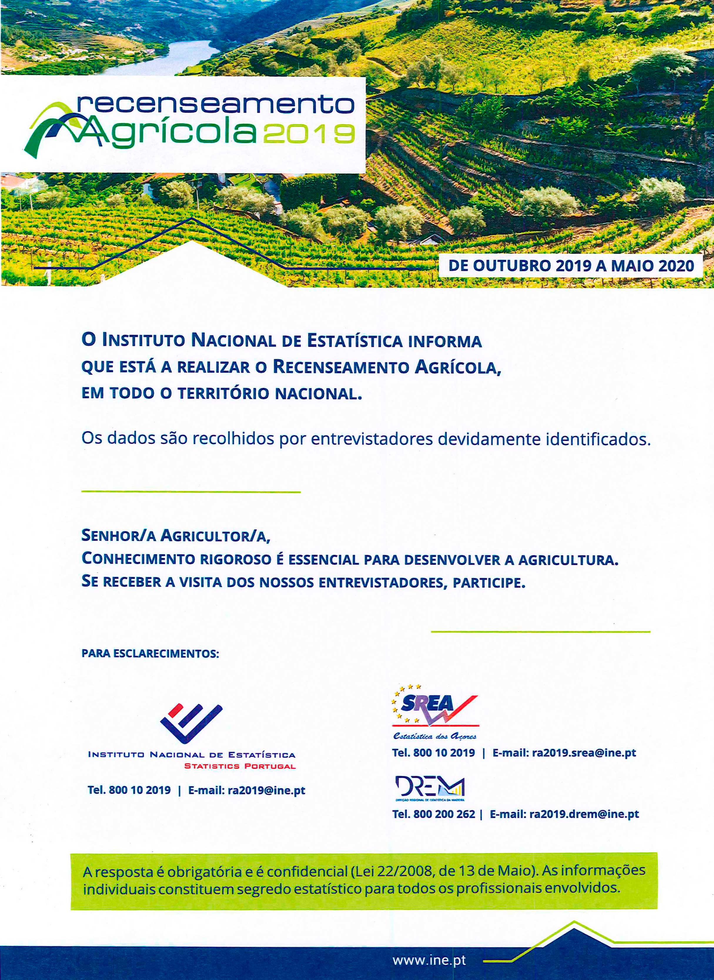 O Instituto Nacional de Estatística (INE) está a realizar o Recenseamento Agrícola 2019 (RA 2019), que se pretende intensificar a partir de janeiro e se prolongará até ao final de maio 2020. Os agricultores serão contactados por entrevistadores devidamente credenciados, sendo a sua colaboração na resposta ao questionário sobre as suas explorações fundamental para garantir a qualidade da informação recolhida e consequentemente dotar o país e as regiões de um ativo de conhecimento rigoroso sobre uma atividade que continua a ser fundamental na sociedade portuguesa.