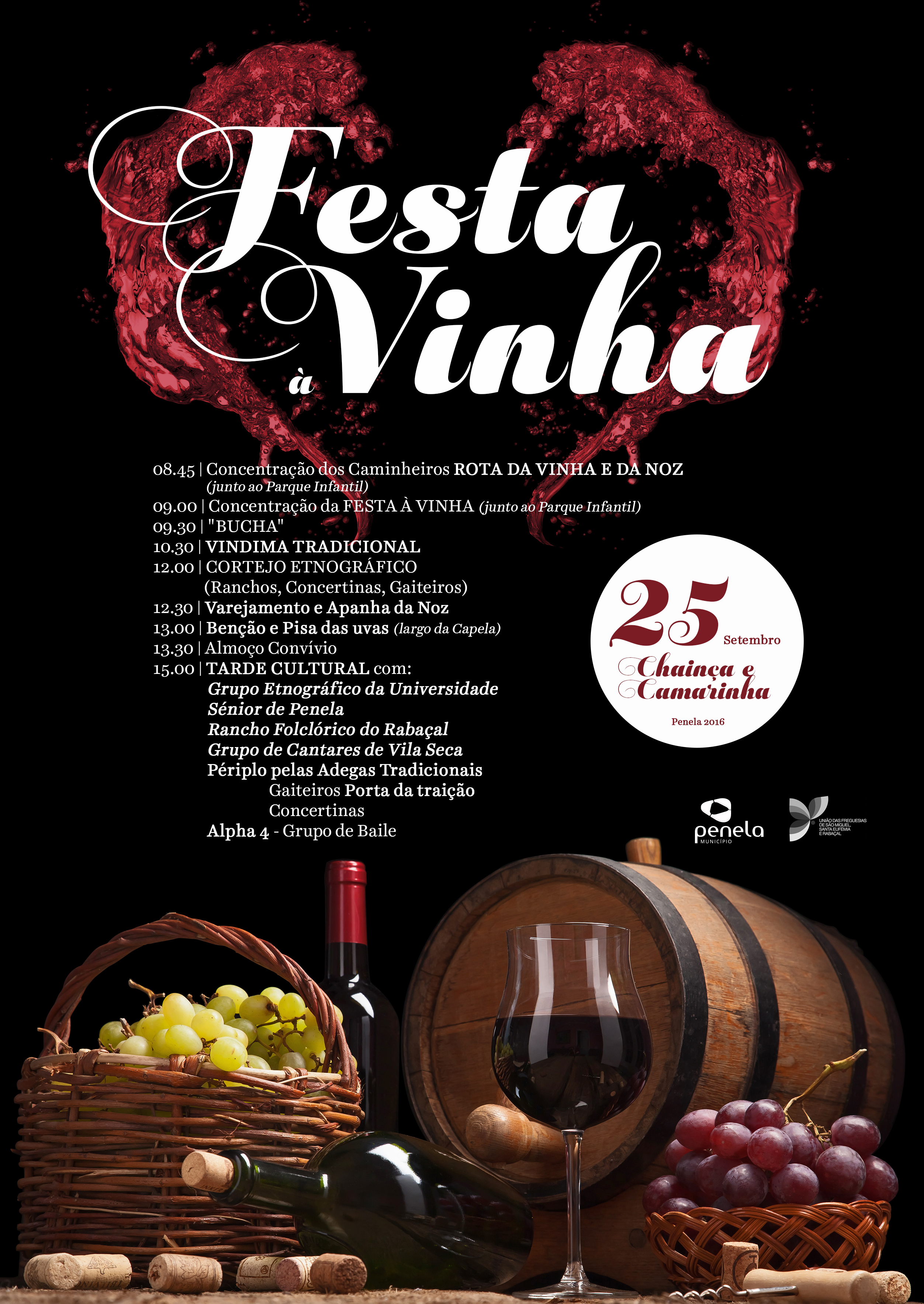 A Festa à Vinha está de regresso à Chainça e Camarinha, já no próximo domingo, dia 25 de setembro e leva a conhecer o processo produtivo do vinho, um dos produtos endógenos do Concelho de Penela. Evento onde é celebrado a vindima. O cartaz da fe